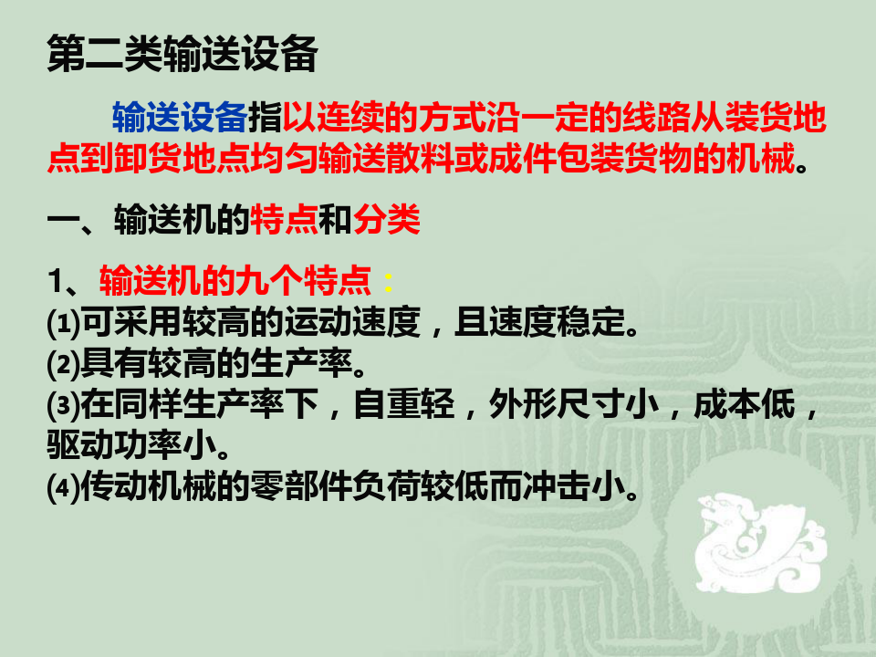 輸送設(shè)備 輸送設(shè)備指以連續(xù)的方式沿一定的線路從裝貨地點到卸貨地點均勻輸送散料或成件包裝貨物的機械。