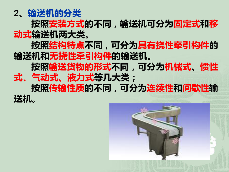 輸送機(jī)的分類 按照安裝方式的不同,輸送機(jī)可分為固定式和移動(dòng)式輸送機(jī)兩大類。 按照結(jié)構(gòu)特點(diǎn)不同,可分為具有撓性牽引構(gòu)件的輸送機(jī)和無(wú)撓性牽引構(gòu)件的輸送機(jī) 按照輸送貨物的形式不同,可分為機(jī)械式、慣性式、氣動(dòng)式、液力式等幾大類; 按照傳輸性質(zhì)的不同,可分為連續(xù)性和間歇性輸送機(jī)。