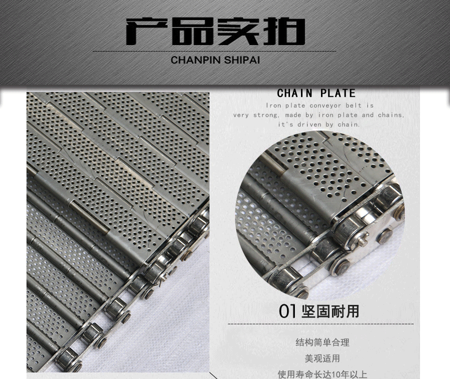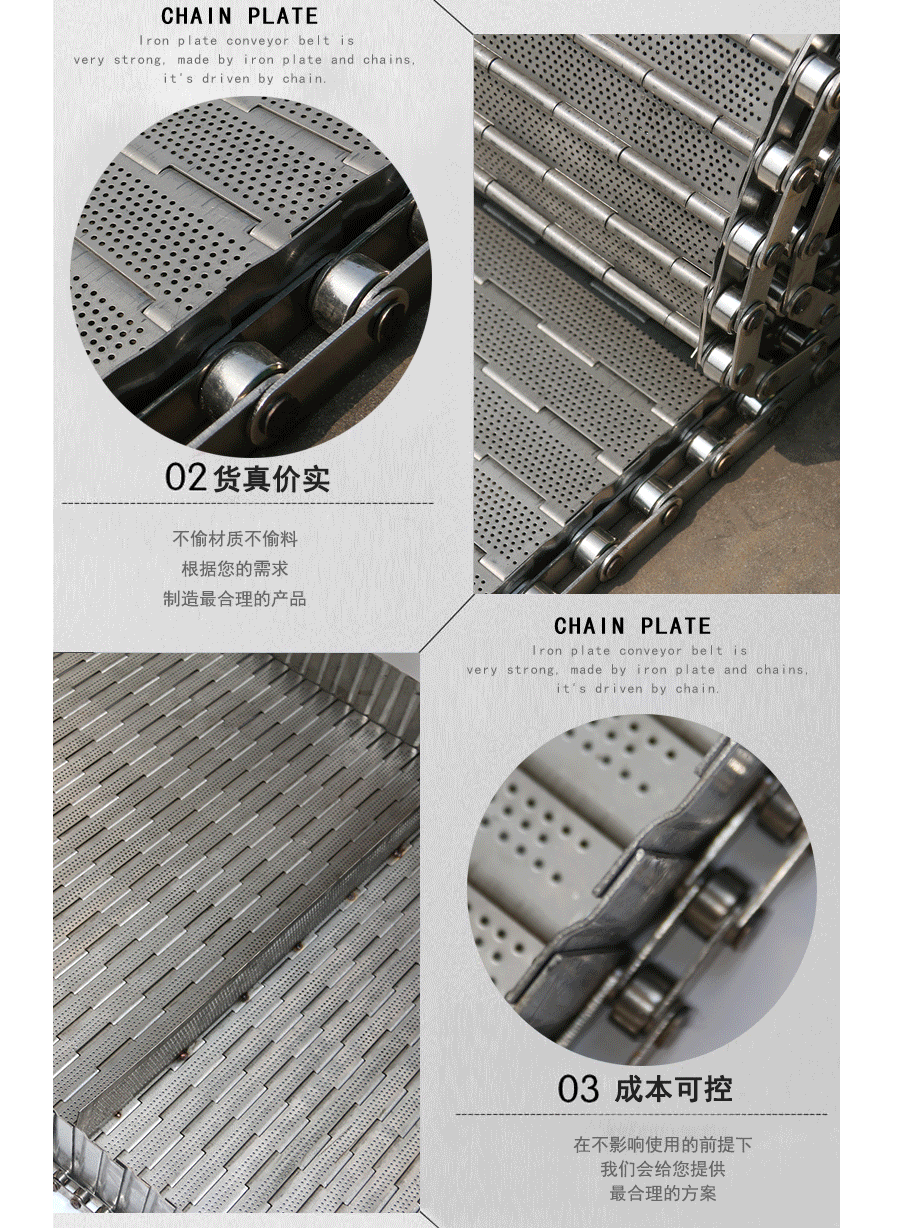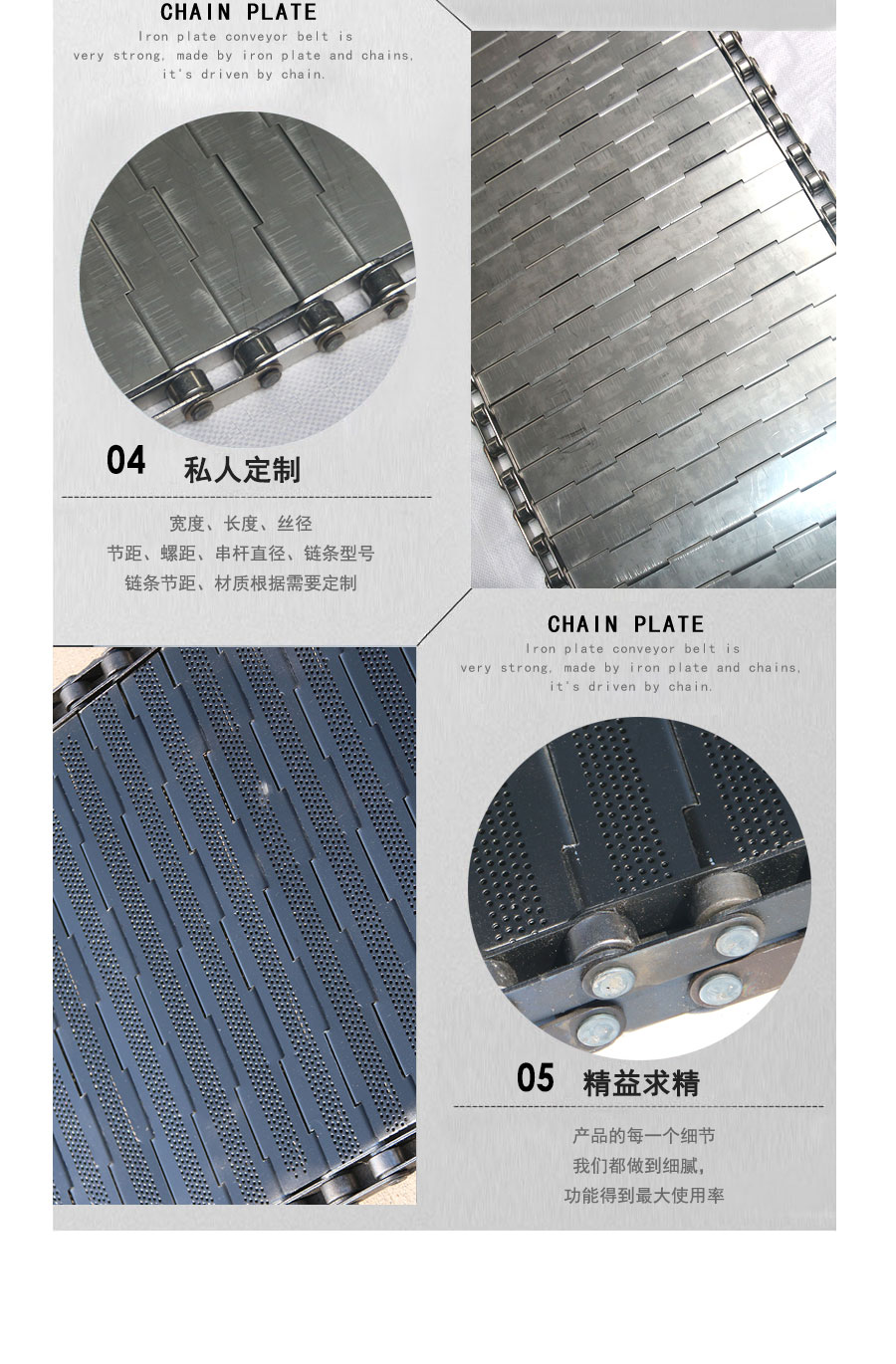 鏈板輸送帶材質(zhì):A3低碳鋼,45#鋼,201不銹 鋼,304不銹鋼,316不銹鋼等。