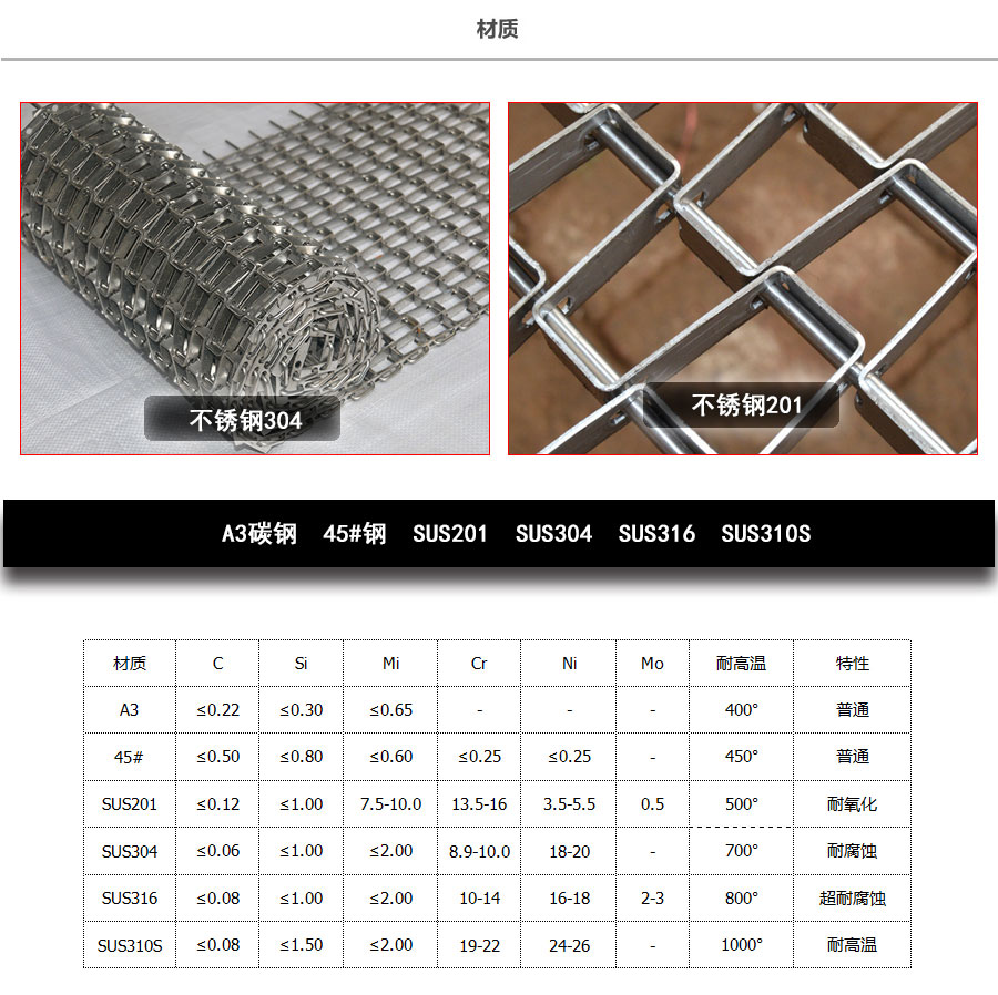 長城網(wǎng)帶材質(zhì):有A3低碳鋼、45#鋼、1Cr13耐熱鋼、 不銹鋼、304不銹鋼、1Cr18Ni9Ti不銹鋼、0Cr18Ni14NO2CU2耐熱耐酸鋼等
