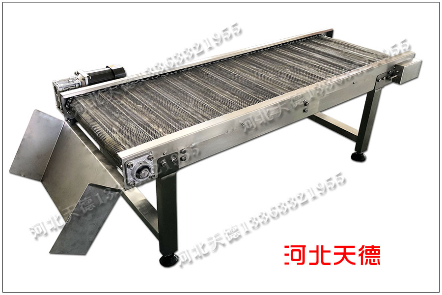 整臺(tái)輸送機(jī)采用不銹鋼304材質(zhì)加工,輸送機(jī)機(jī)架厚度為3毫米,金屬輸送帶鋼絲編織鏈條輸送帶來傳送物料。