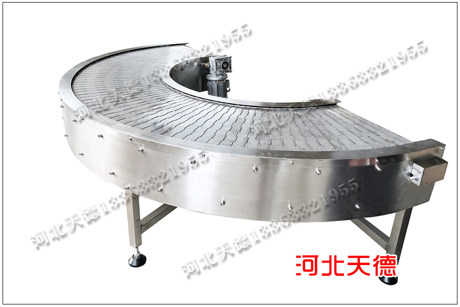 浙江金華市客戶定制的轉(zhuǎn)彎鏈板輸送機(jī),轉(zhuǎn)彎角度為90度,采用2毫米厚的不銹鋼板轉(zhuǎn)彎加工,輸送機(jī)寬度為700毫米,高度為60公分,采用可調(diào)節(jié)機(jī)腿,上下能隨意調(diào)節(jié)將近10公分,客戶可以根據(jù)自己的需要來(lái)調(diào)節(jié),輸送鏈板的寬度為 650毫米,鏈節(jié)距為38.1毫米,采用8毫米的串桿直徑。整臺(tái)機(jī)械用來(lái)輸送食品,因此采用別的材質(zhì)不銹鋼304材質(zhì)。