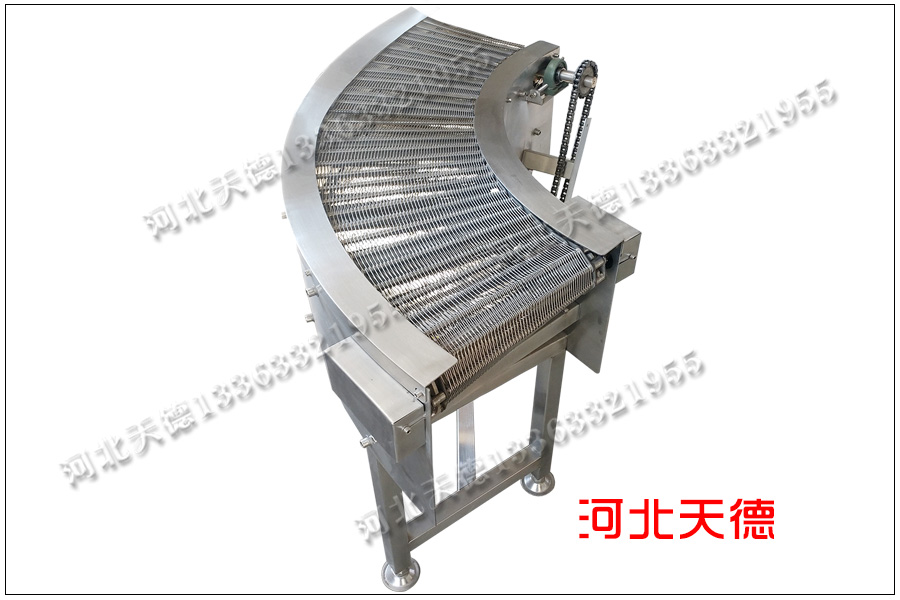 整個機器采用不銹鋼材質(zhì),轉(zhuǎn)彎角度根據(jù)客戶的需要定制的,寬度大概為40公分,輸送帶采用網(wǎng)狀鏈條輸送帶,輸送平穩(wěn)且成本低,是食品行業(yè)中不錯的選擇。